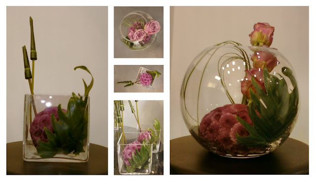 Receptacle: 3 round glass vases (different hights and dimiters), floral foam cubes covered with Aspidistra Leaf